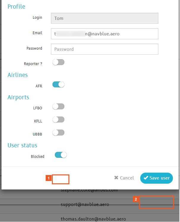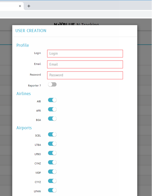 Once you enter login credentials and email address, you can use the sliders to configure the airlines and airports that this new user can access.