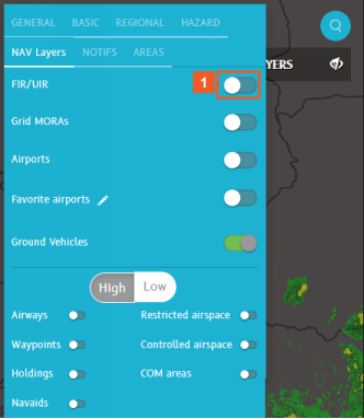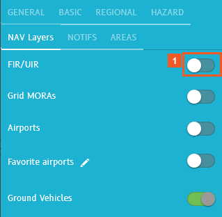 You can enable the display of Flight Information Regions (FIR) and Upper Information Regions (UIR) on the map from within NAV Layers.