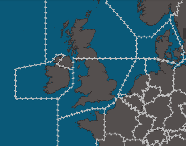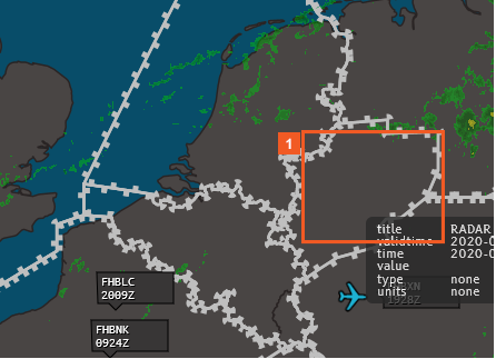 In this example, because of the default zoom levels set for the display of FIR/UIRs, the white, chunky lines showing FIRs do not display.