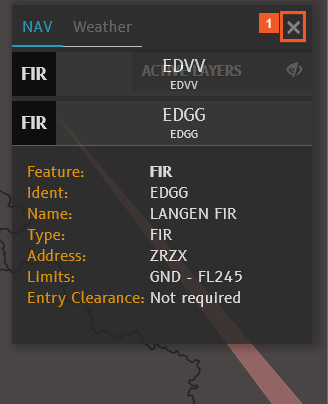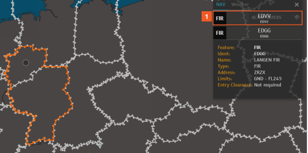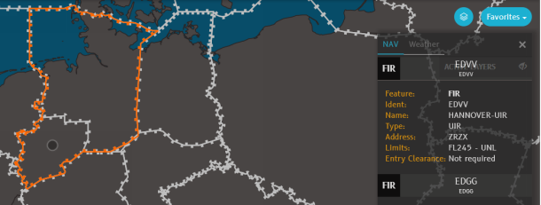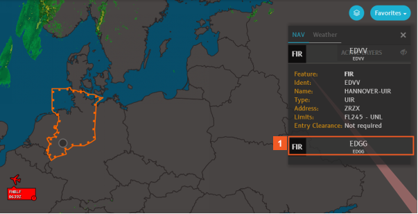 When you expand the information displayed for EDGG, the selected FIR is highlighted in orange on the map. This is particularly useful when FIRs overlap, as in this example.