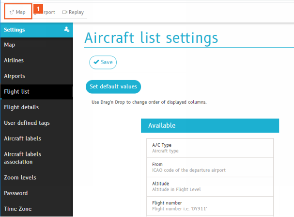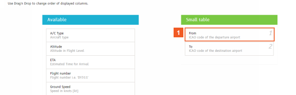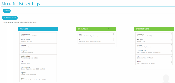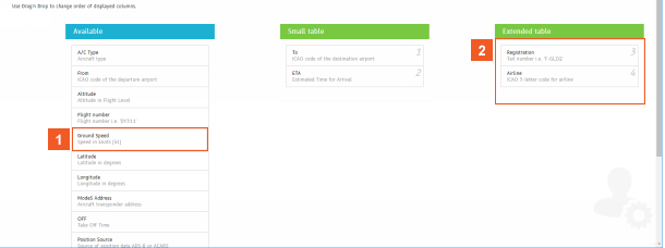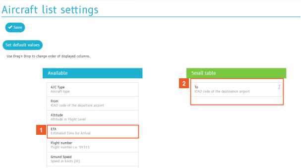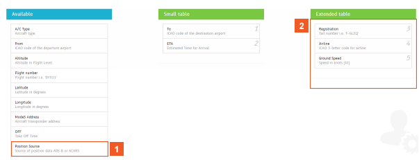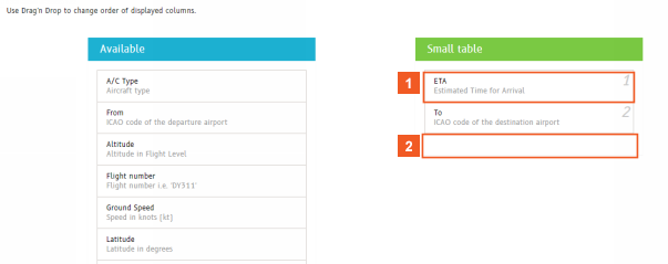 On the Aircraft list settings page, it is possible to configure the Flight List based on available data elements. You can choose whether selected data elements display when the list is minimized or maximized. The one identifier that cannot be removed from displaying is the Flight ID.