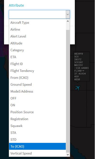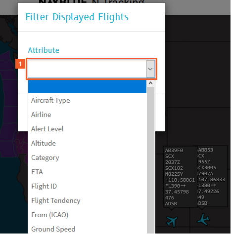 This image shows some of the many aircraft attributes you can use to filter the aircraft that display on the map (and in the Flight list).