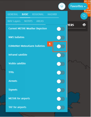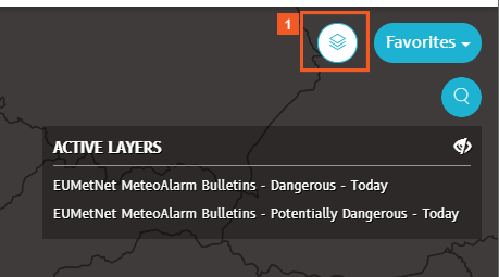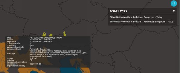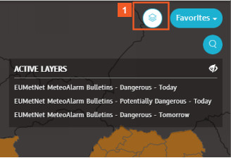 When you finish viewing the bulletins relevant to your task, you can hide all the sub-layers by clicking the EUMetNet MeteoAlarm bulletins slider.