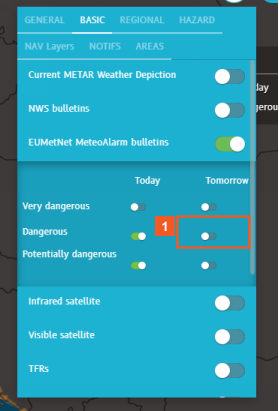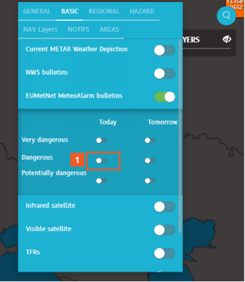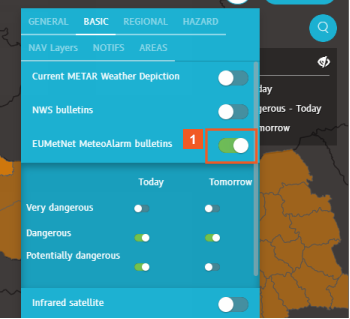 The EUMetNet MeteoAlarm bulletins layer expands out to provide options to view hazards for either today or tomorrow.