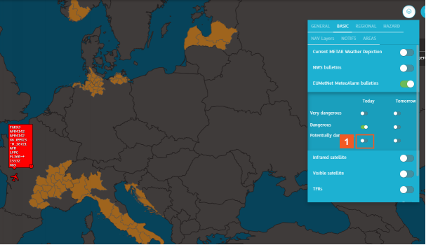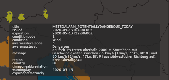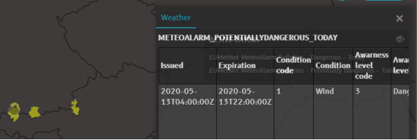 Hover over the yellow shapes in Germany. N-Tracking displays the EU MetNet bulletin about potentially dangerous winds in this area for today.