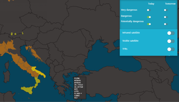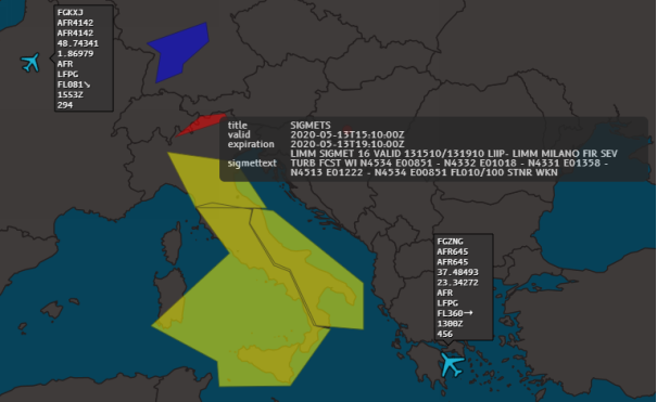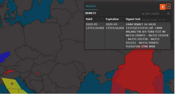Hover over the yellow SIGMET in the north of Italy and review the information provided.