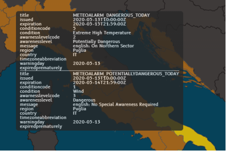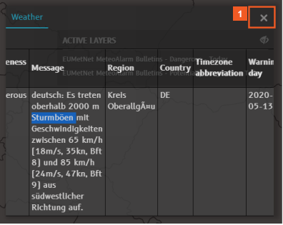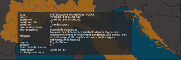 The Message column displays information about the weather hazard (in the language of the affected country).