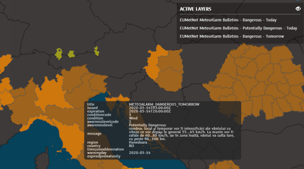 Hover over an affected area and N-Tracking displays the bulletin on-screen. In this example, potentially dangerous winds in the region of Hunedoara display.