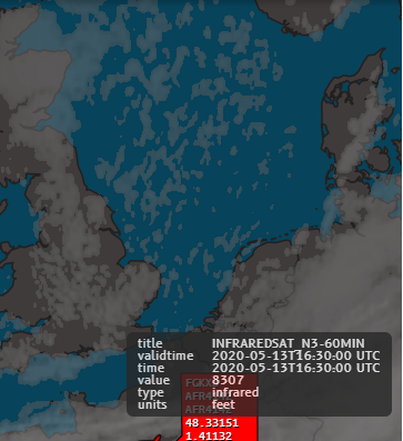 The cloud cover over the south-east coast of England has a cloud height of 8,307 feet.