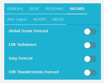 For more details on working with the last three layers in the HAZARD tab, consult the topic, Display Weather Hazards: EDR Turbulence, Icing Forecast, and EDR Thunderstorms Forecast.