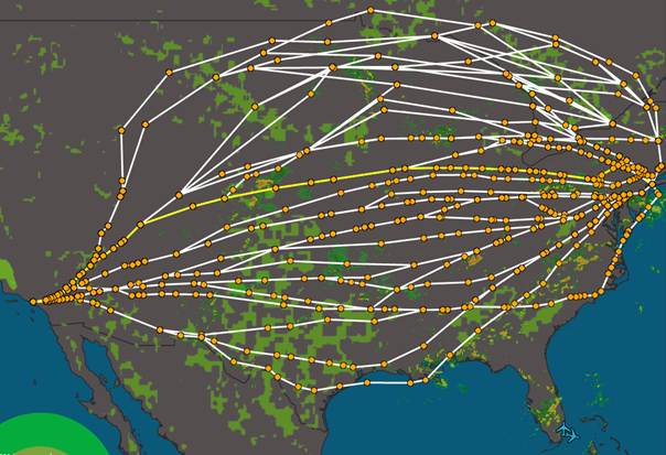 The route pair used in this example, crossing the entire U.S., includes many routes.