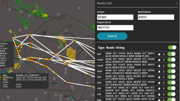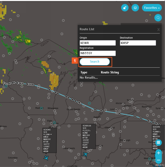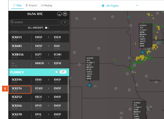 You can view scheduled flights for an intervalranging from six hours before to eight hours after their planned takeoff. When Weather Layers are active on the map, you can analyze and evaluate the planned route more effectively.