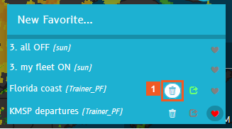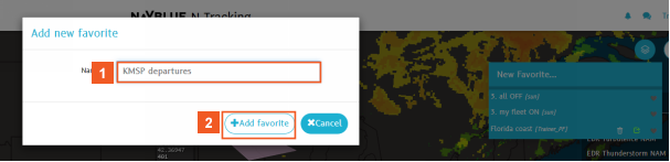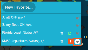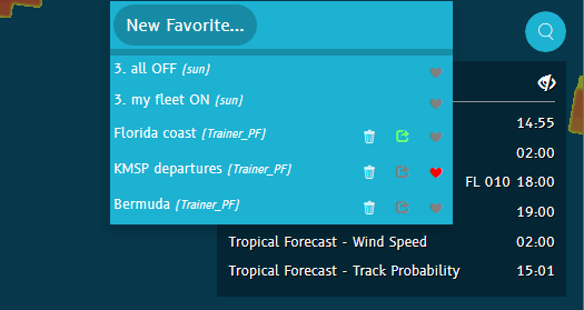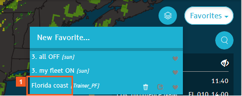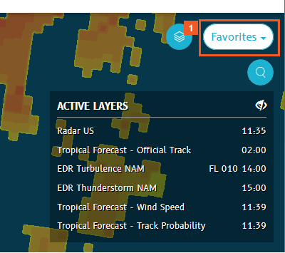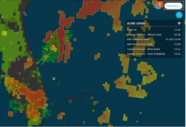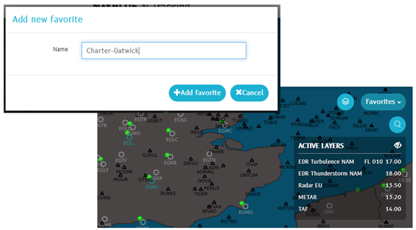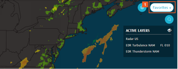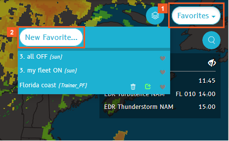 Create map favorites to quickly retrieve a snaphot-like group of settings to reuse in your flight planning and tracking tasks later. When you save and/or share favorites, you also save your map zoom setting, any activated weather layers, and even filtered aircraft lists.