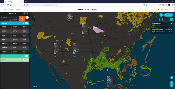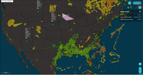 Your favorite settings are implemented on the map again. For example, you can see the official track for the tropical storm again and the OTHERS section of the Flight List shows Delta flights only. You could proceed to do whatever work it is that you want to do with the map set up this way.