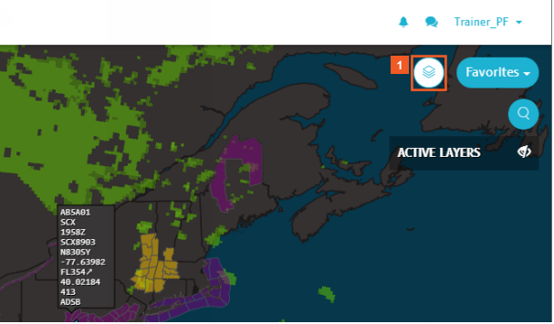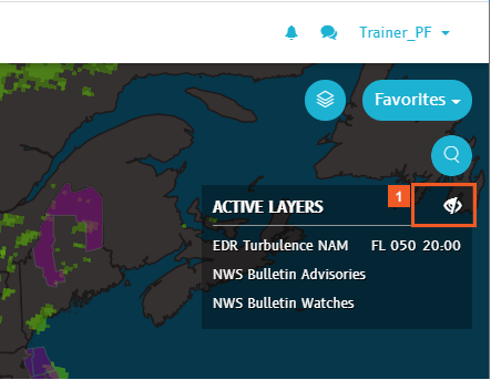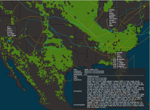 In this example, one of the HAZARDS weather layers (EDR Turbulence NAM) is active. Note: It was active at the beginning of this exploration.