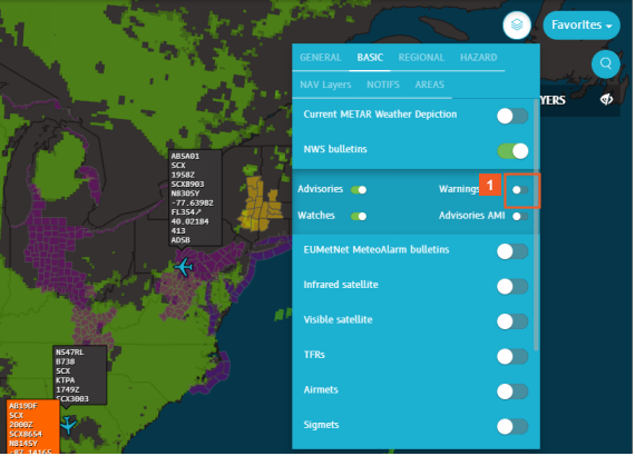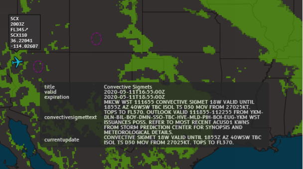 Hover your mouse over any NWS warning that may be of concern to you. These warnings may not be relevant to flight conditions.