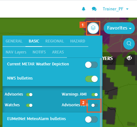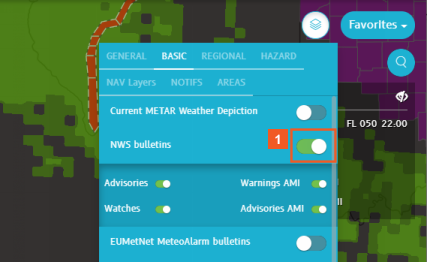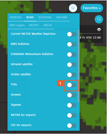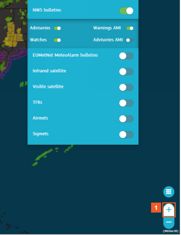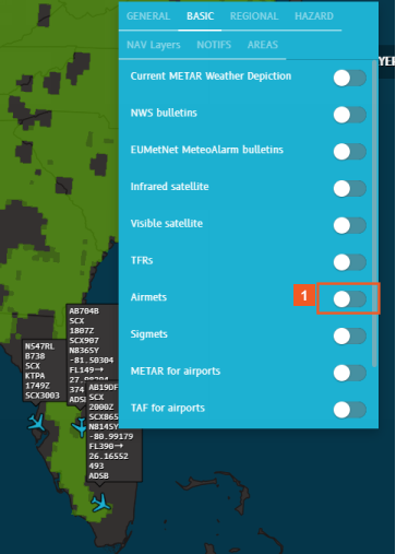 NOTE: The weather layers Infrared and visible satellite, Current METAR Weather Depiction, METAR for airports, and TAF (Terminal Aerodrome Forecast) for airports apply globally and are covered in separate topics.