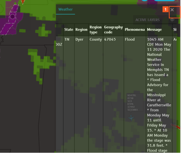 In this example, none of the aircraft you are tracking are flying near areas affected by weather bulletins.