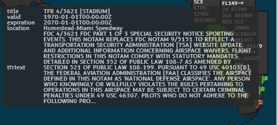 In this example, if you hover over the highlighted orange flag, N-Tracking identifies flying restrictions 30 NM west of Miami, FL.