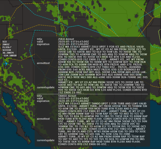 Hover over the area that interests you and N-Tracking displays information for both the icing (ZULU) and the turbulence (TANGO) AIRMETs active for the area.