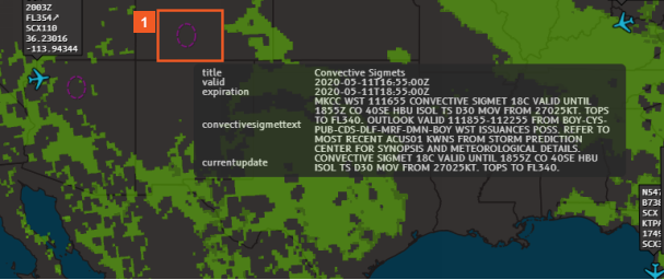 Hover over the highlighted purple oval with a dashed outline. It represents an area of convection. N-Tracking displays SIGMET details in an on-screen pop-up.