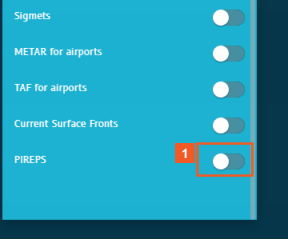 Next, let's look at the PIREPS (Pilot Reports) layer. For a clearer view of PIREPS, disable the Sigmets and the Current Surface Fronts layers, as needed.