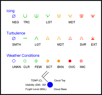 PIREPS use a variety of symbols to indicate weather information. Hover your mouse over any of the symbols and N-Tracking displays the provided information on-screen.