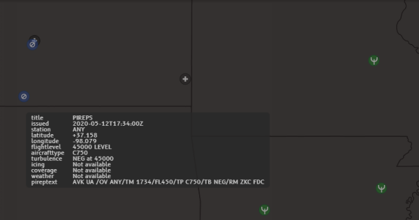 To provide better visibility for the PIREPS symbols, for this next part of this exploration, the North American turbulence forecast layer has been disabled.